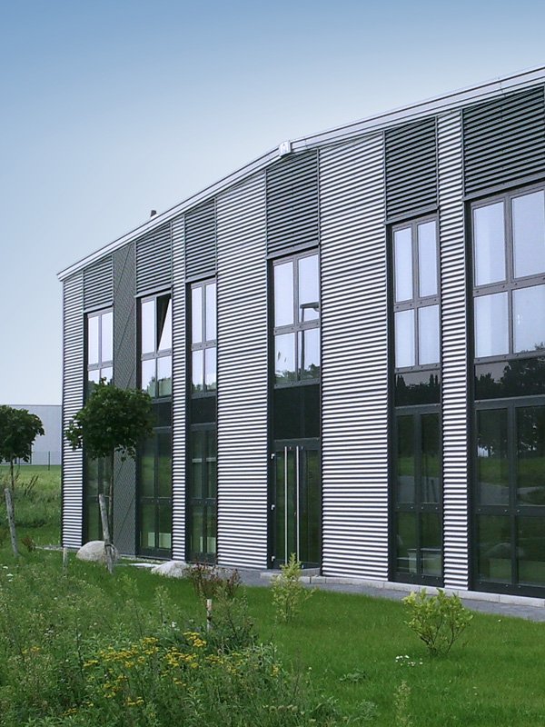 Auf knapp 1.500 m² Produktions- und Bürofläche entstand für Bruns Zerspanungstechnik über zwei Bauabschnitte eine hochmoderne Produktionshalle. Durch die unterschiedliche Verlege-Richtung der Fassadenplatten wurde eine moderne und ansprechende Optik geschaffen, was auch die senkrechte Anordnung sowie die Farbgebung der Fensterflächen noch weiter unterstreicht.