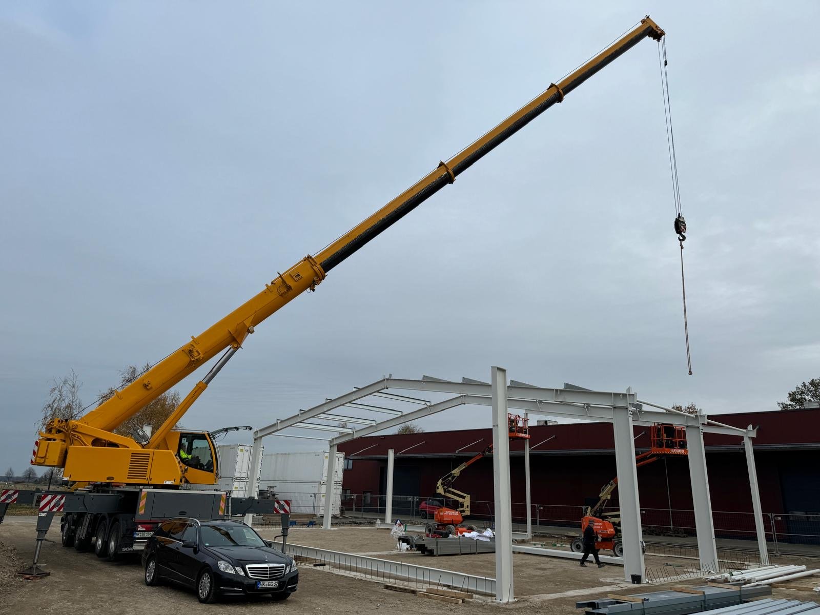 Eine neue isolierte Stahlhalle mit einer Breite von 25,00 m und einer Gesamtlänge von 19,00 m entsteht zur Zeit in Peine. Die Isolation in Dach und Wand wird in Sandwichpaneelen ausgeführt.